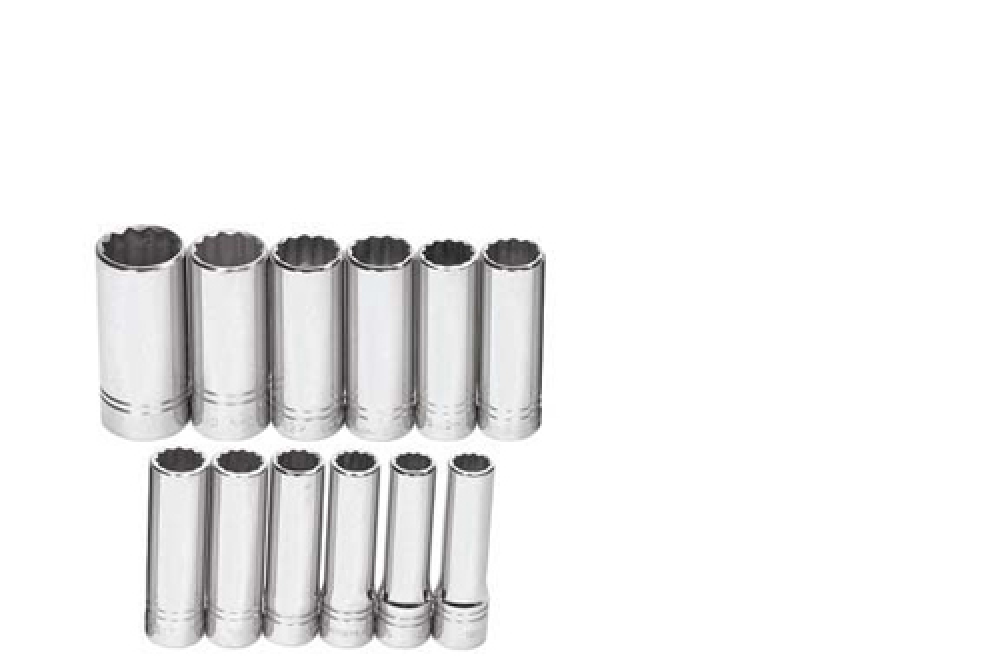 L'ensemble de 12 douilles profondes métriques à 12 pans et entraînement de 1/2 pouce comprend une variété de tailles conçues pour accéder aux fixations profondes, idéales pour les applications automobiles et industrielles.
