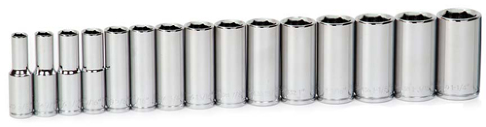 L'ensemble de 16 douilles profondes métriques à 6 pans de 1/2 pouce comprend une variété de tailles, idéales pour s'attaquer aux fixations profondes dans les travaux automobiles et mécaniques.