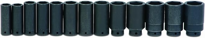 Le JH Williams WS-14-19RC est un jeu de 19 douilles à chocs profondes à 6 pans de 1/2 pouce conçu pour les applications lourdes. Ce jeu comprend des tailles de douilles allant de 3/8" à 1-1/2", offrant une couverture complète pour diverses tâches de fixation. Les douilles sont dotées d'ouvertures lobulaires SUPERTORQUE®, qui permettent une plus grande puissance de rotation sans déformer la fixation, garantissant un engagement maximal sur les fixations à 6 points. Elles sont spécialement traitées thermiquement pour une utilisation à impact, offrant une longue durée de vie, une sécurité et une durabilité. La finition industrielle noire améliore la résistance à la corrosion, ce qui les rend adaptées à une utilisation avec des clés à chocs pneumatiques et électriques.