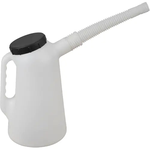 This measuring funnel is made of translucent high-density polyethylene for durability and visibility. It includes a flexible polyethylene spout designed for hard-to-reach areas. The funnel is spill-proof thanks to a cap on the spout and a polypropylene lid. Graduated for precise measuring.