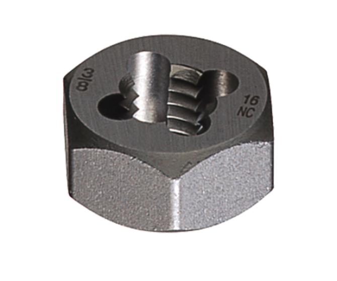 The die features a standard construction and a hexagon shape, making it suitable for general-purpose rethreading tasks. This general-purpose hexagon rethreading die is ideal for maintenance, production, or custom fabrication, providing reliable and accurate results in every operation.
