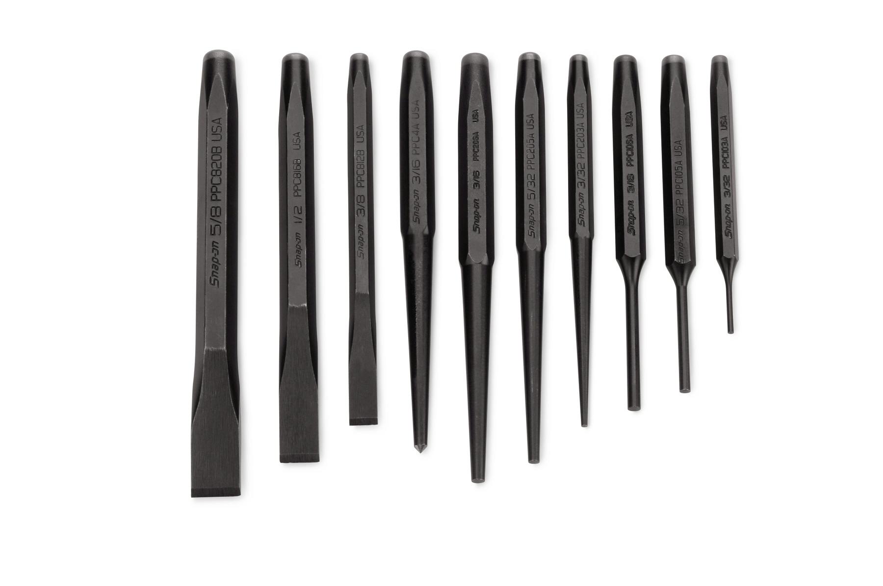 The Snap-On punch set includes various sizes for marking, aligning, and driving pins, essential for precision work in mechanical applications.