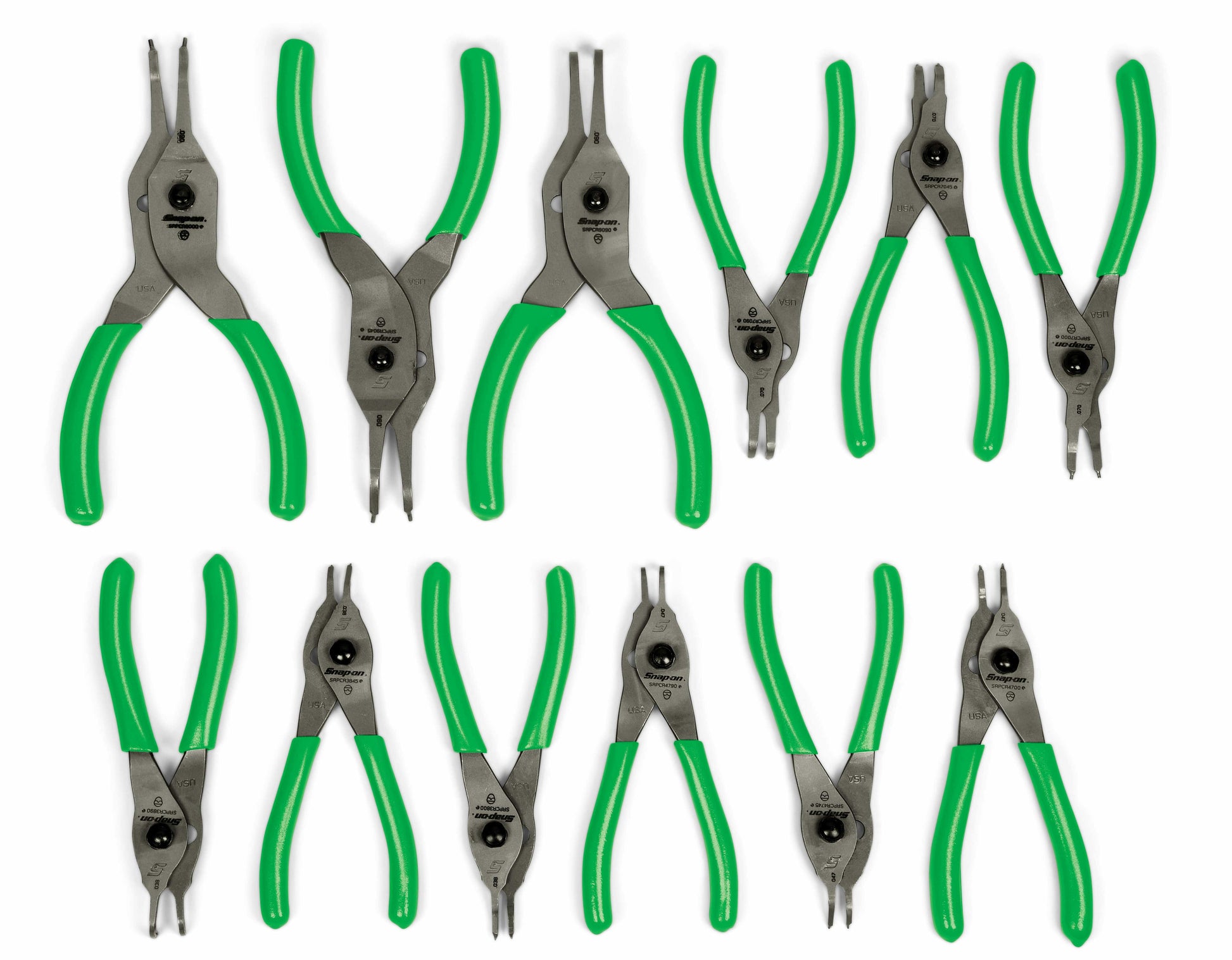 The 12 Piece Circlip Pliers Set (Green) includes various sizes and styles, providing versatility for installing and removing circlips with ease.